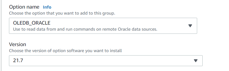 OLEDB_ORACLE can be activated on an RDS instance through an option group. For more information, see Working with Option Groups. You can create or use an existing option group for SQL Server based on the edition of your RDS DB instance.
