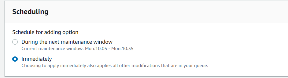 Modify the DB instance and associate the option group created in the previous step to the existing RDS for SQL Server instance. For more information, see Modifying an Amazon RDS DB instance.