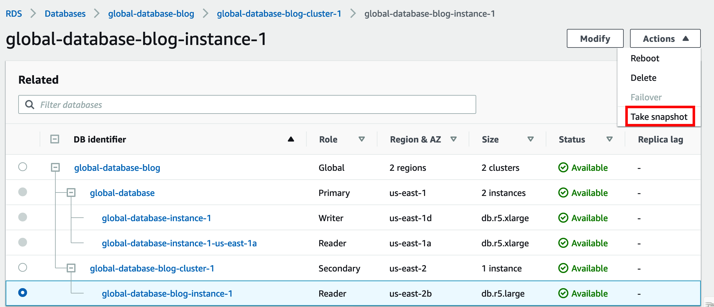 - In the secondary Region, select the reader instance in the secondary cluster.