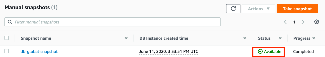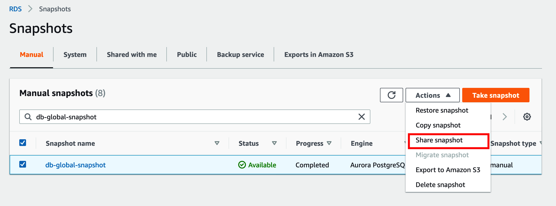 - Select your snapshot and on the Actions menu, choose Share snapshot.
