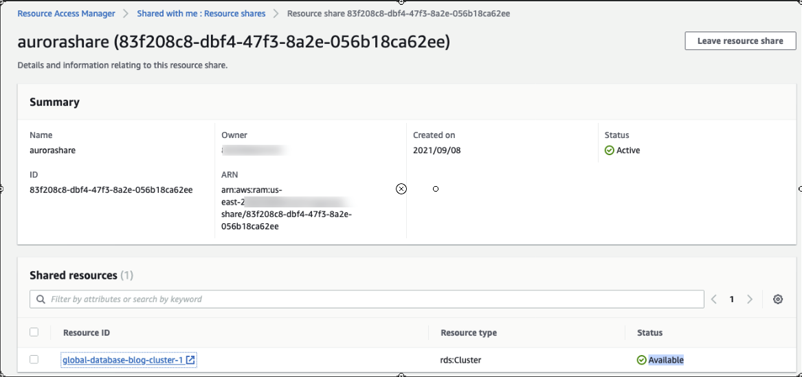 First, you need to grant the DR account permission to clone the secondary cluster. We use AWS Resource Access Manager (AWS RAM) to securely share your resources across AWS accounts, within your organization or organizational units (OUs) in AWS Organizations, and with IAM roles and IAM users for supported resource types.