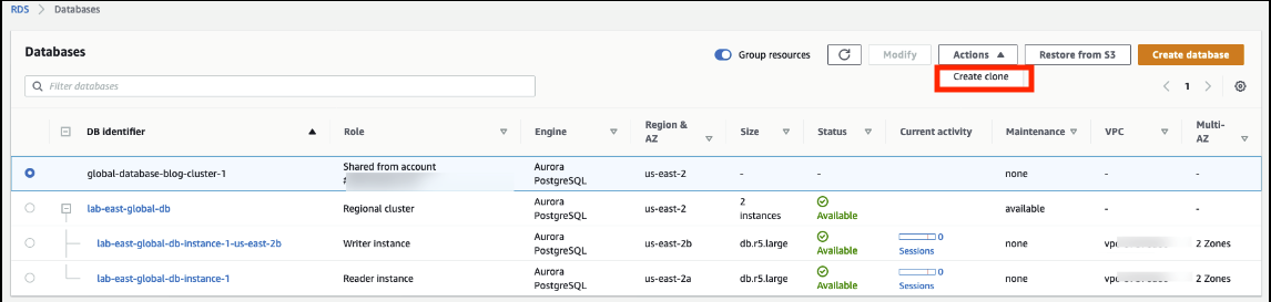 Next, you should see a shared cluster in the DR account in the secondary Region for creating a clone.