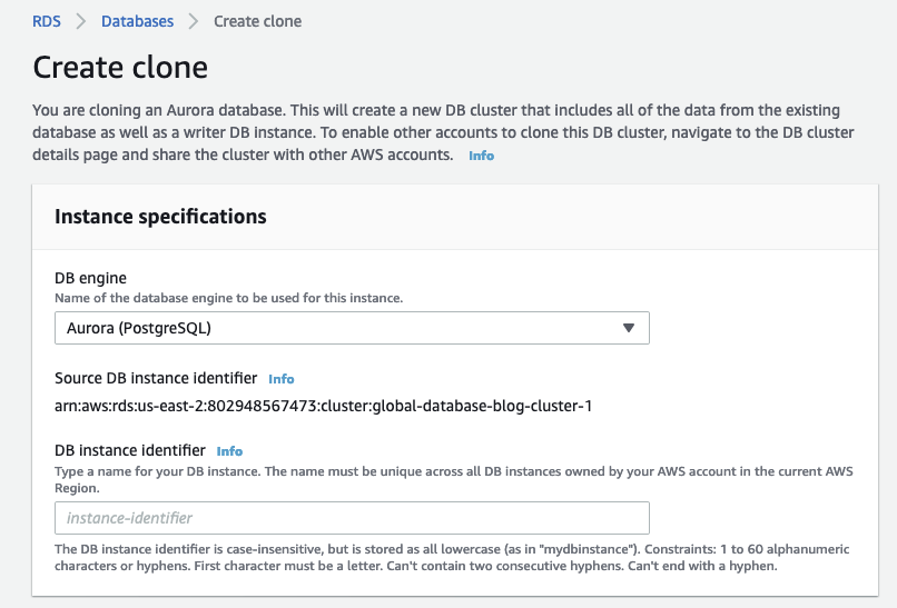 - Enter the instance class, VPC, and other required details to create the cloned cluster.