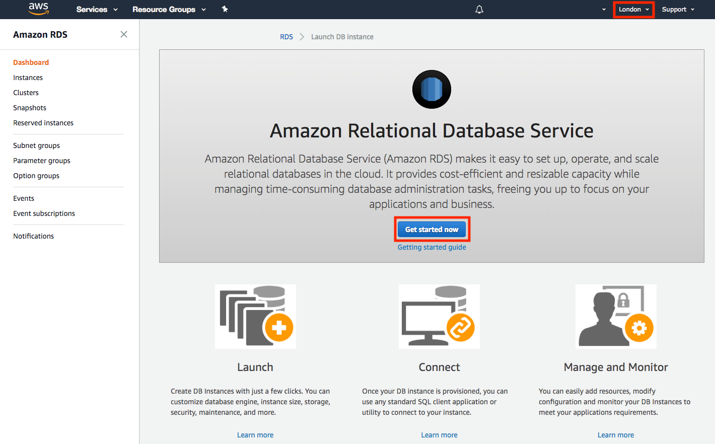 - I always double check that I am in the same Region, (EU) London, as the KMS key I created. Choose Get started now.