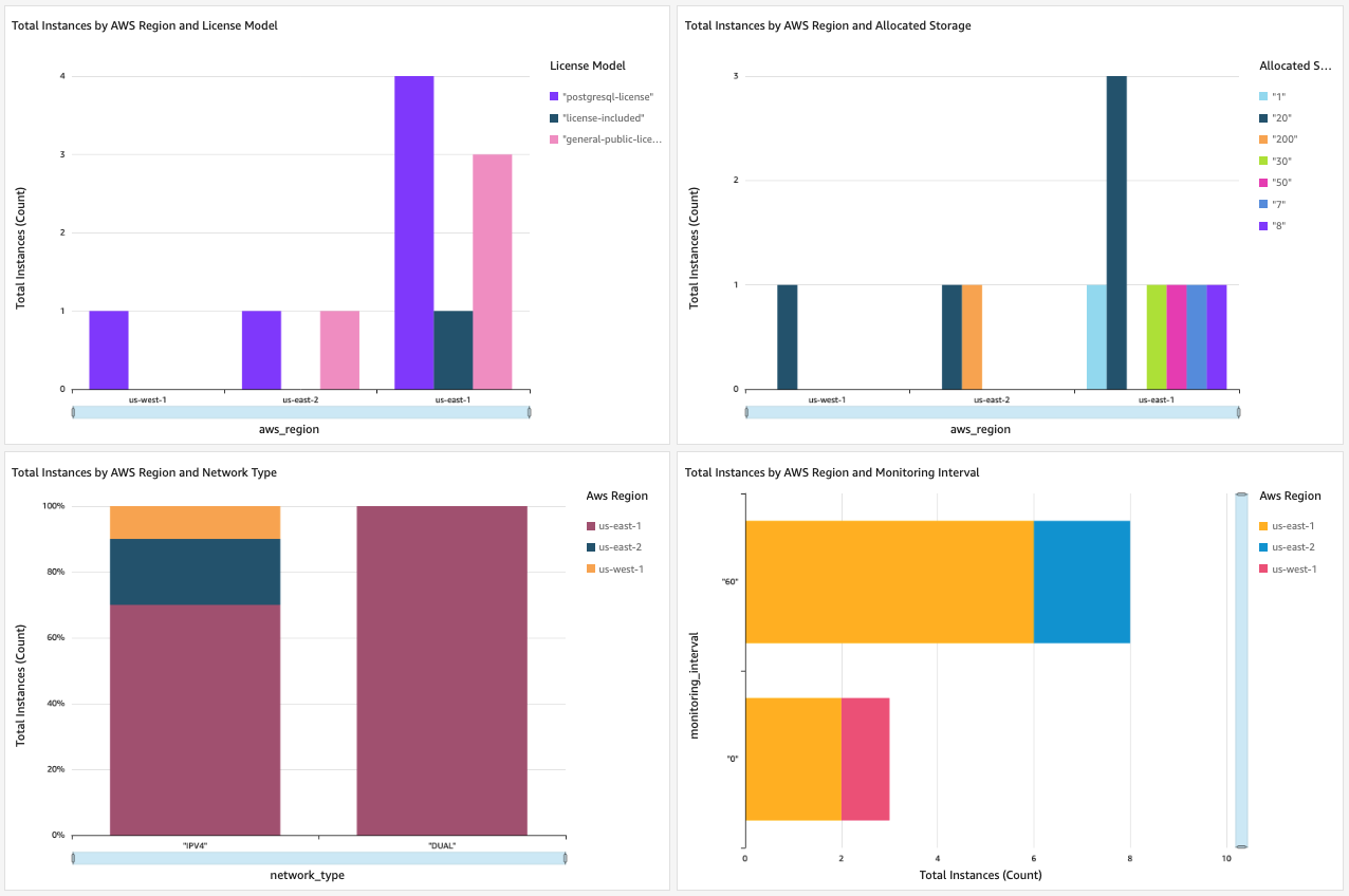 With a consolidated view, you can view various aspects of your Amazon RDS fleet, from high-level metrics such as total instance counts and engine distributions to detailed configuration elements such as encryption status, backup retention periods, and maintenance windows. The following screenshot shows example metrics in a Quick Suite dashboard.