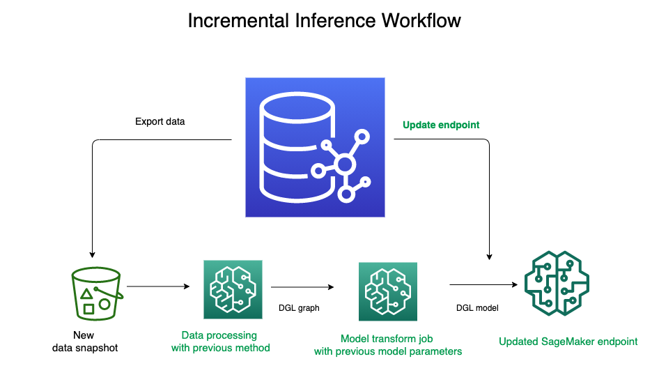 Consider the following scenario in which you have a property graph that you use for fraud detection on user account nodes. After a week, some new user accounts have been created that have some connections to existing user accounts in the graph. Previously, after the new user nodes were loaded into the Neptune graph, you needed to retrain the model to be able to obtain predictions for the new nodes. Now, to obtain model predictions on new data, you only need to run the following steps: