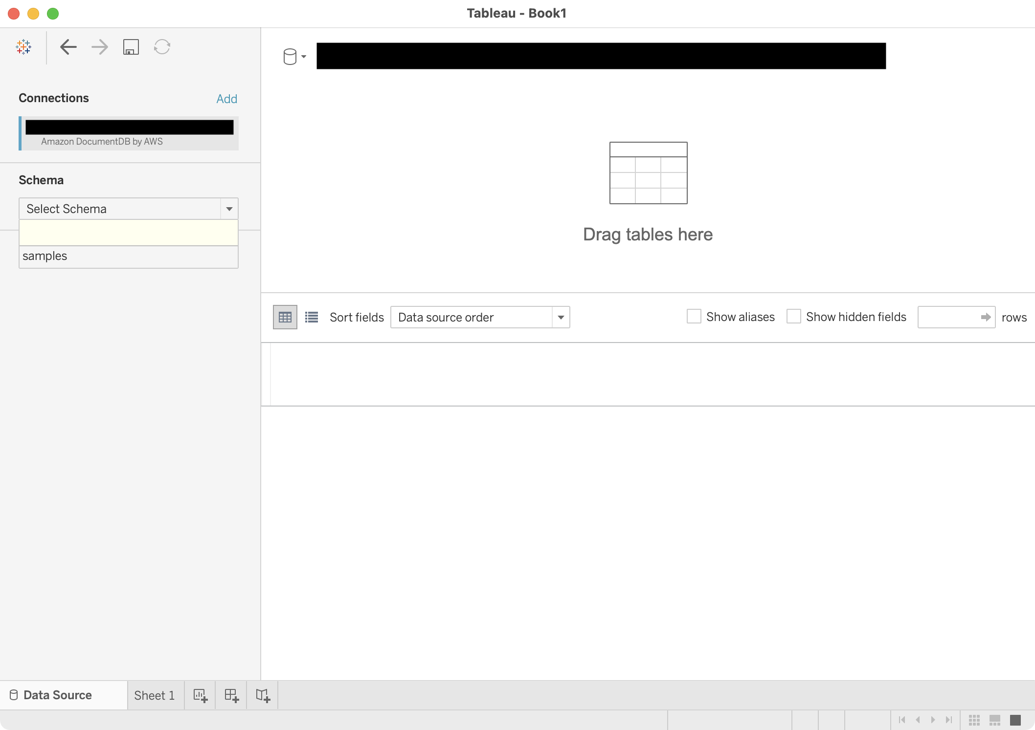 After you connect to your Amazon DocumentDB cluster, you see the data source page. This page shows the connection (the Amazon DocumentDB cluster endpoint) in the left pane and at the top of the canvas.