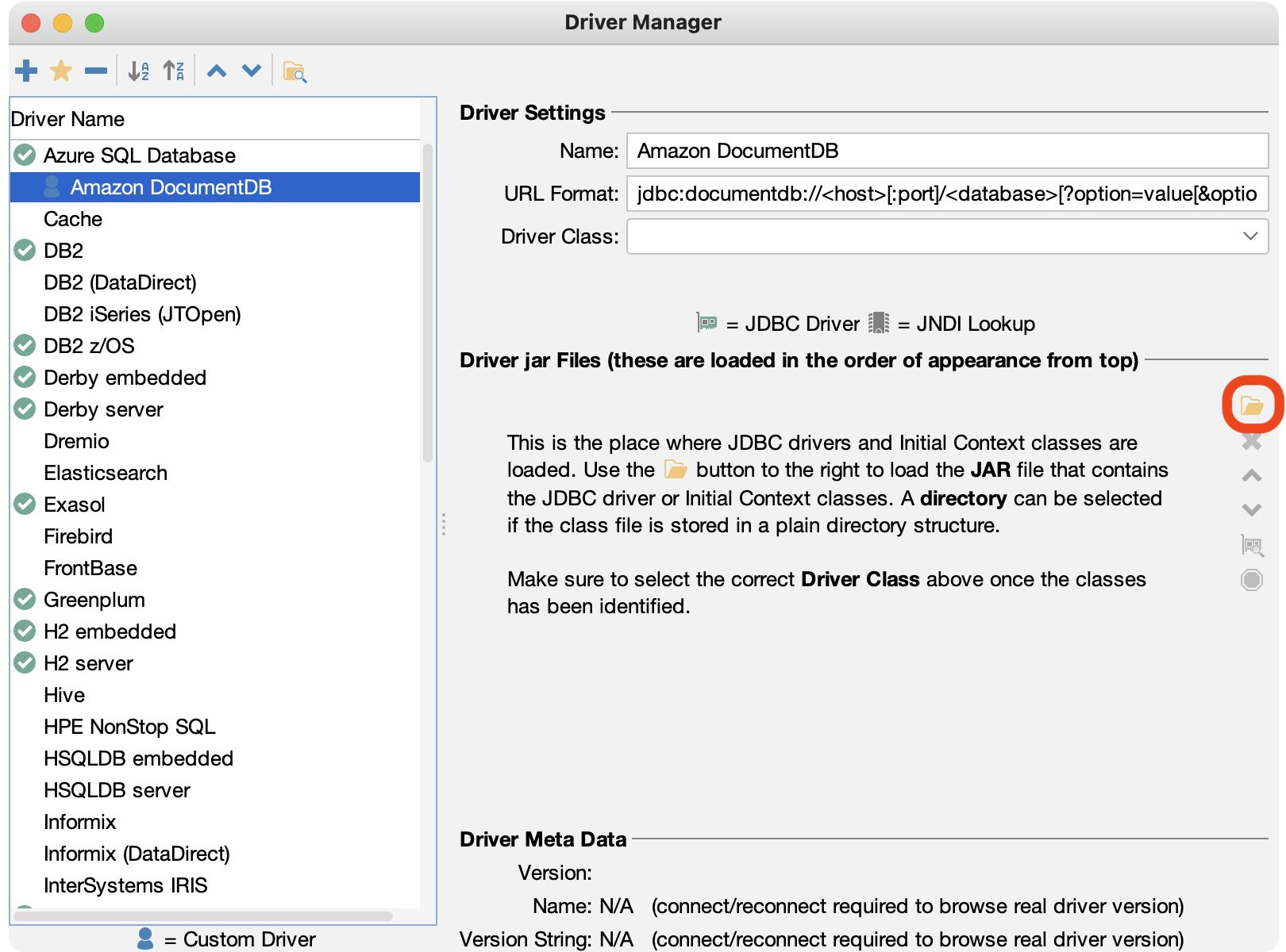 - In the Driver jar Files section, choose the Open file icon.