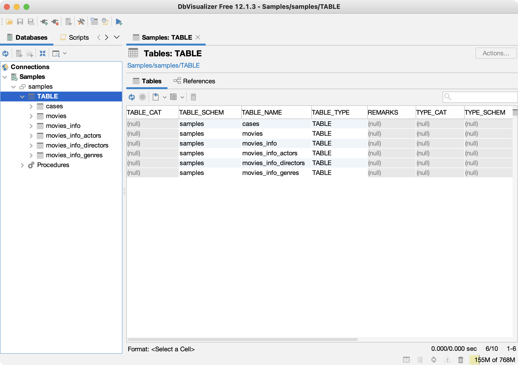 - Choose the samples schema to see the tables created by the JDBC driver.