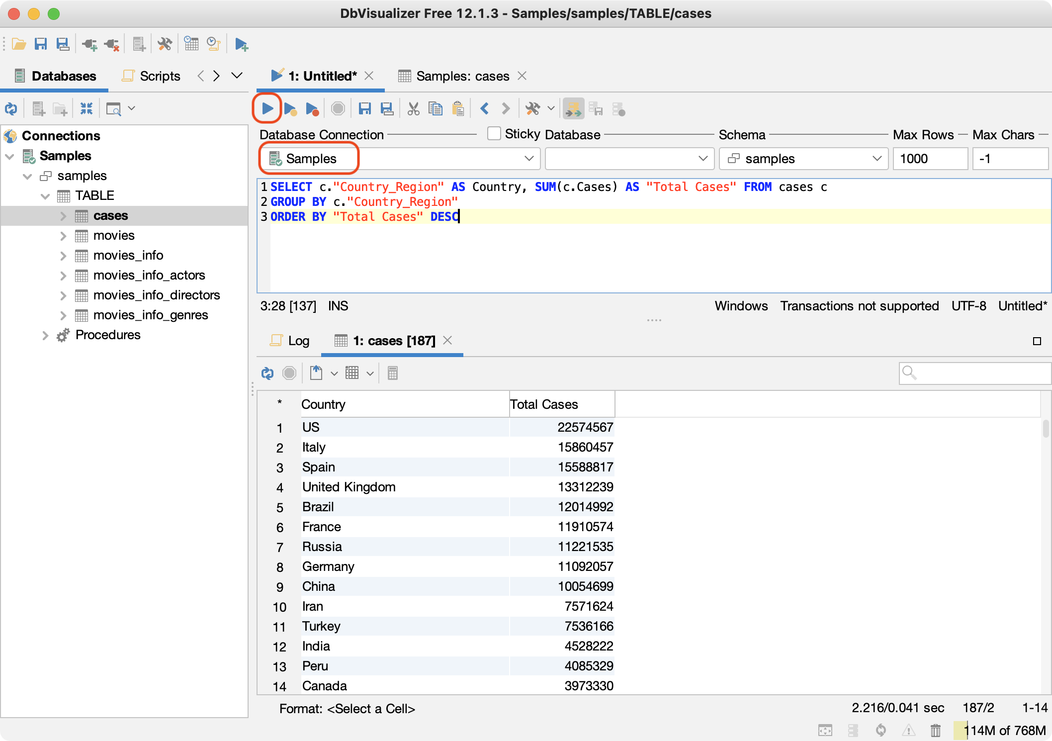 - Choose the Execute icon get a list of countries ordered by the total case count.