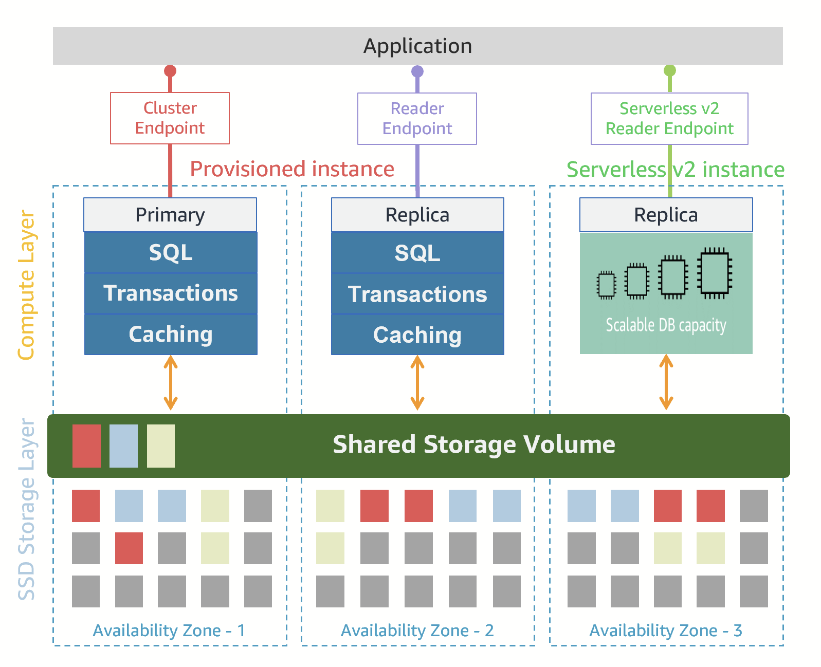 - Aurora replica (read-only instance) – Connects to the same storage volume as the primary DB instance and supports read operations only