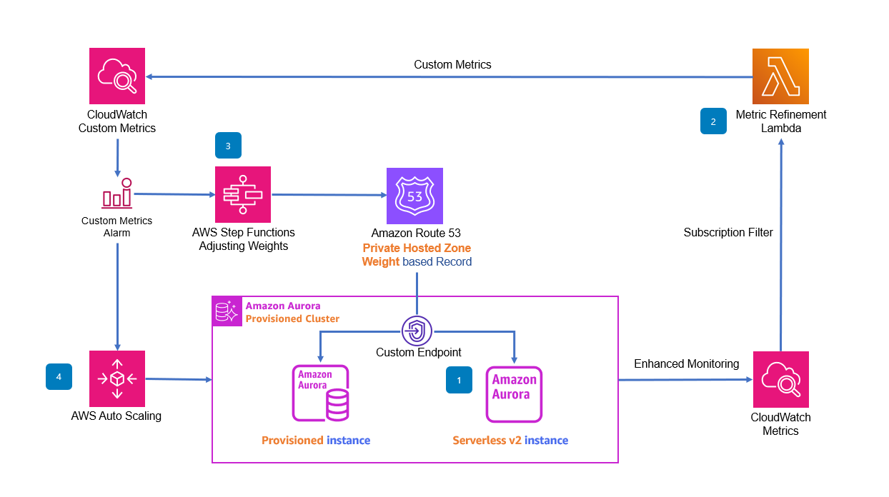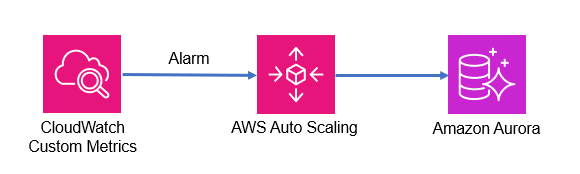 The custom Aurora Auto Scaling architecture handles database load with the following logic: