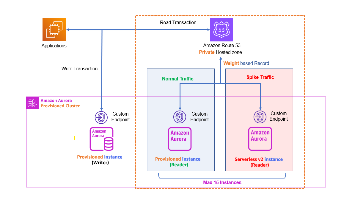 With this process, the normal traffic that can be handled by a configured DNS (Domain Name System) address is handled by an instance connected to a provisioned custom endpoint. Load traffic above a threshold is handled by an Aurora Serverless v2 read-only instance, increasing the reliability of the service at minimal cost.