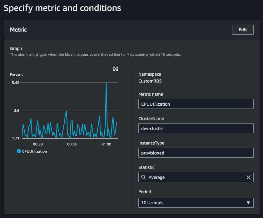 Create a CloudWatch alarm using the custom metrics you created earlier. System reliability can be increased by setting fewer data points for a high database load and more data points for a low database load. You can increase the alarm data point frequency by up to 10 seconds by using custom metrics rather than AWS namespace metrics.