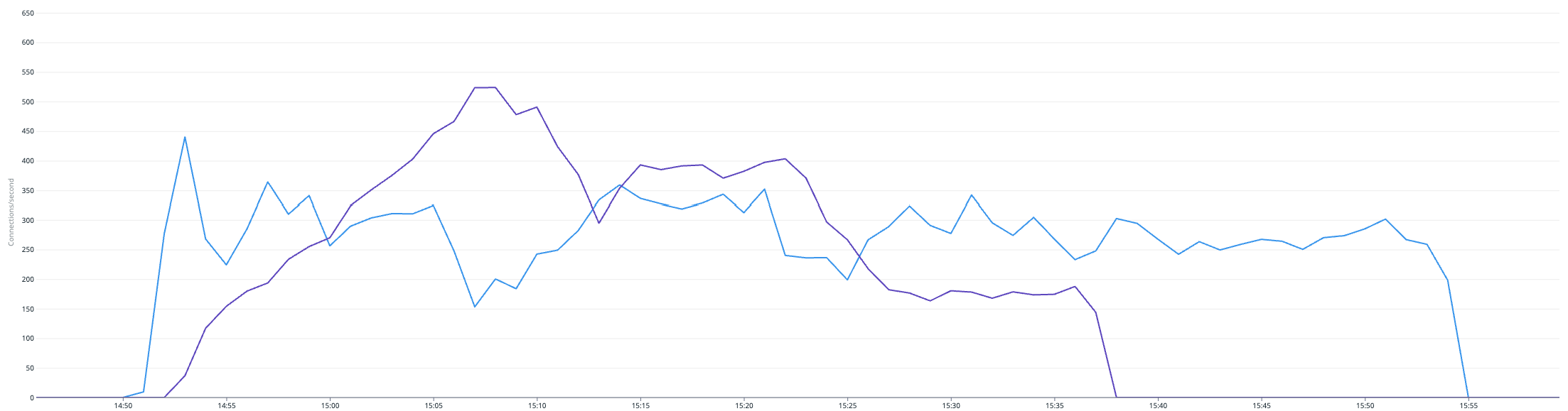 In this test, 100% CPU usage was reached and a service failure occurred for about 10 minutes due to the large amount of traffic that occurred immediately after the test started.