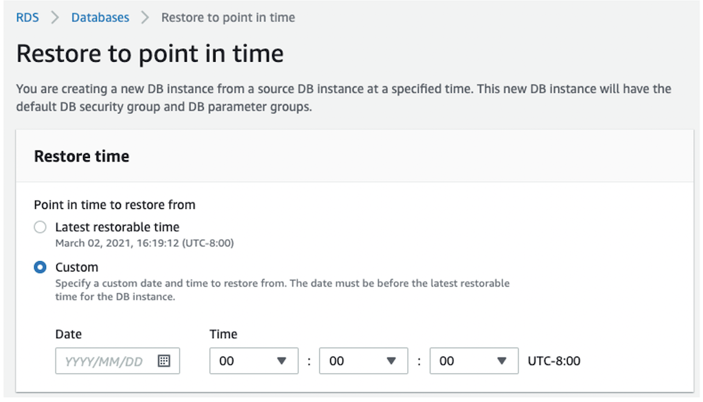 To restore using PITR, on the Amazon Relational Database Service (Amazon RDS) console, choose Databases in the navigation pane. Select the cluster DB identifier to be restored and on the Actions menu, choose Restore to point in time. On this page, you can configure the restore time and cluster properties.