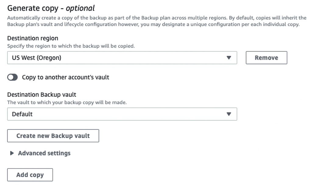 AWS Backup extends Aurora MySQL’s disaster recovery capabilities by providing Cross-Region backup protection. You can copy backups to multiple AWS Regions, either through on-demand copies or scheduled backup plans. The service uses backup plans to define the scheduling and destination of your Aurora MySQL backups, with backup vaults serving as secure storage locations in destination Regions. When copying to a new Region, AWS Backup performs a full copy of the Aurora MySQL backup.