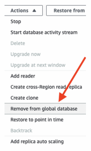 In the event of a disaster, you need to remove the DR cluster from the global database and promote it to a standalone cluster. To remove the DR cluster from a global database, select it on the Amazon RDS console and choose Remove from global database on the Actions menu.