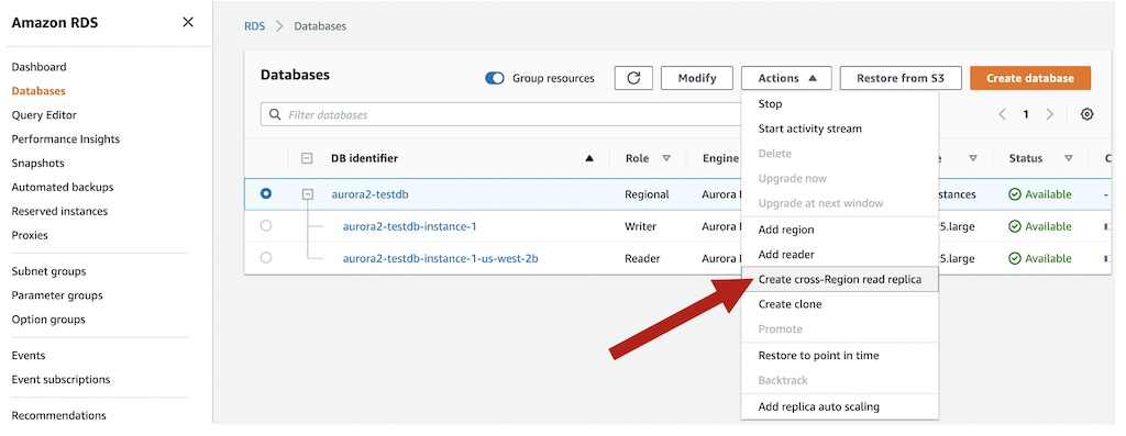 After the binlogs are enabled, the cross-Region read replica feature is the easiest way to get started. The setup process performs all steps required, including creating the destination Aurora cluster. On the Amazon RDS console, select the Aurora cluster and on the Actions menu, choose Create cross-Region read replica.
