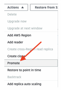 In the event of a disaster, you can promote the cross-Region replica to a standalone database. If possible, first check the replica lag in CloudWatch or with the SHOW SLAVE STATUS query to determine the RPO of the data. Then proceed by going to the Amazon RDS console, selecting the DR cluster, and on the Actions menu, choosing Promote.