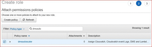 - Select the box next to the policy you created previously i.e. dmsautoscaler, and choose Next: Review