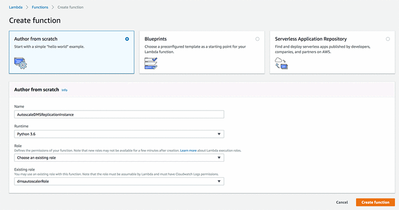 - Give your function a name. I chose AutoscaleDMSReplicationInstance