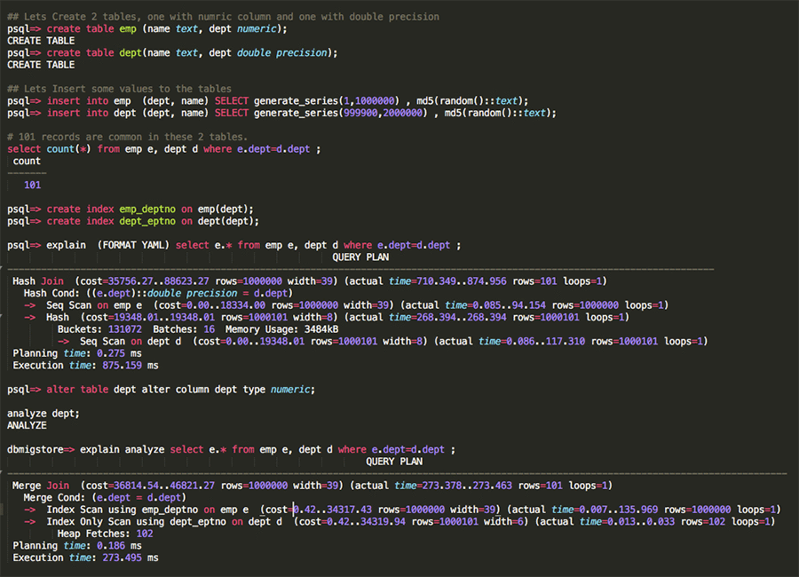 Solution – To illustrate this problem, I have created two tables in PostgreSQL, one with numeric columns and one with double precision. I have also added indexes on these two columns. As you can see from the execution plan listed below, the optimizer chooses Seq Scan when the tables are joined on numeric and double precision columns. As soon as you change the column data type from double precision to numeric for dept table, the optimizer chooses the right execution plan i.e. Index Scan. Make sure you pay attention to columns without any precision during the migration and override number columns (without any precision) to Numeric.