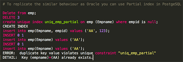 One way to replicate Oracle’s behavior is to use partial index in PostgreSQL, following snippet demonstrates the usage of partial index.