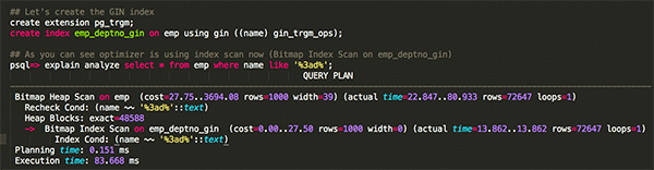 Well, above query is not using the index at all, why? To understand the reason why the index wasn’t picked by optimizer in this case, I want to first understand the gin_trgm_ops operator that was used while creating the GIN index.