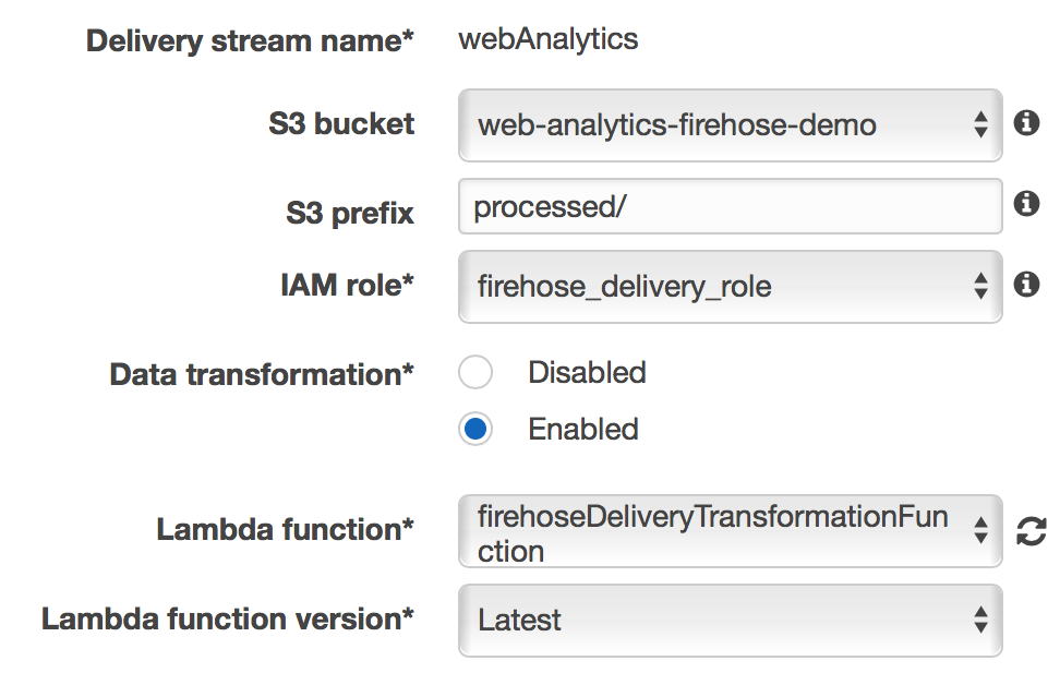 webAnalytics. In the Details tab, choose Edit. Select Enabled for Data transformation, and choose thefirehose_delivery_rolefor IAM role. For Lambda function, selectfirehoseDeliveryTransformationFunction. Then choose Save to save this configuration.