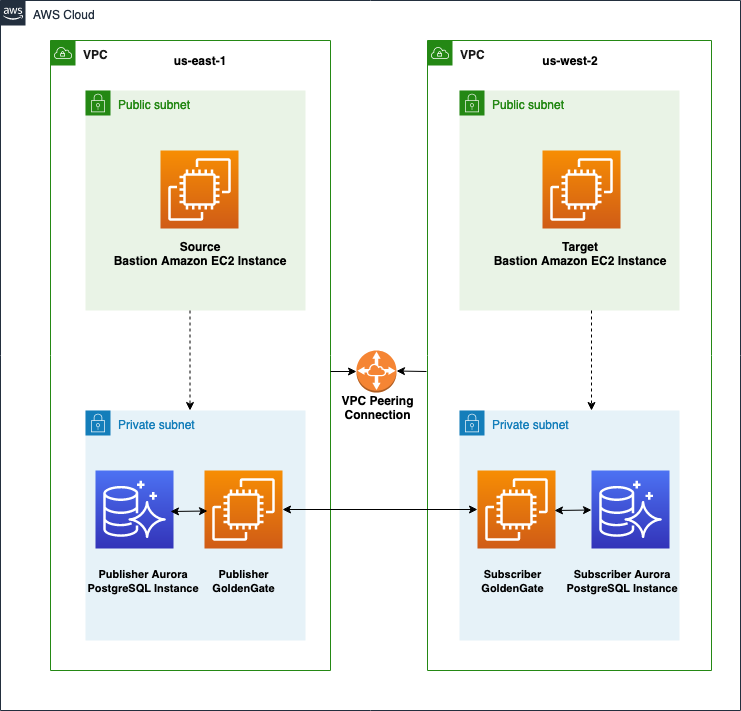 In this post, we show you how to set up multiple Amazon Aurora PostgreSQL-Compatible Edition clusters and use Oracle GoldenGate bi-directional replication to synchronize databases either within a single Region or across multiple Regions to support these different scenarios. Oracle GoldenGate is a software product that allows you to replicate, filter, and transform data from one database to another database. Due to their existing Oracle GoldenGate licenses or DBA expertise, many AWS customers are looking to use their existing GoldenGate software and knowledge to augment and enhance their Aurora database deployments.