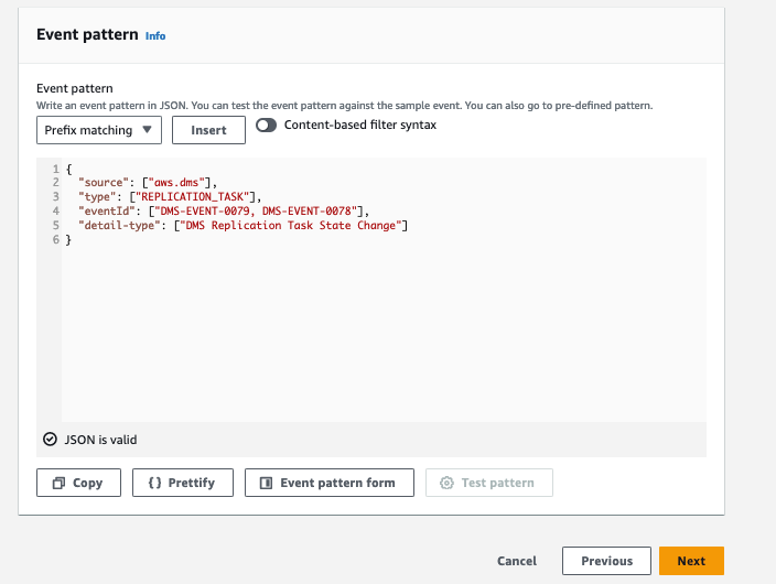 Note: Update DMS events by incorporating DMS operational events into EventBridge rules, enabling the automatic restart of DMS tasks. It is essential to exercise caution when selecting these events, ensuring that only those that do not necessitate intervention are included in the EventBridge rule.