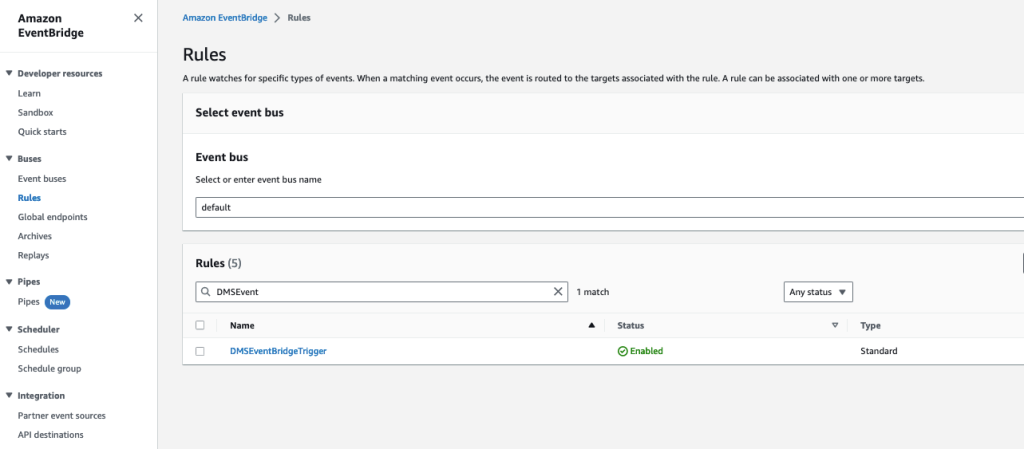 - Go to Amazon EventBridge and select DMS rule you created in previous section.