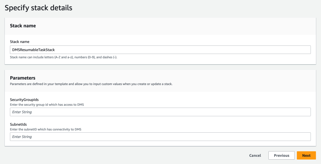 DMSResumableTaskStack. - Provide Security group ID and Subnet ID for AWS Lambda function which must provide connectivity to DMS API.