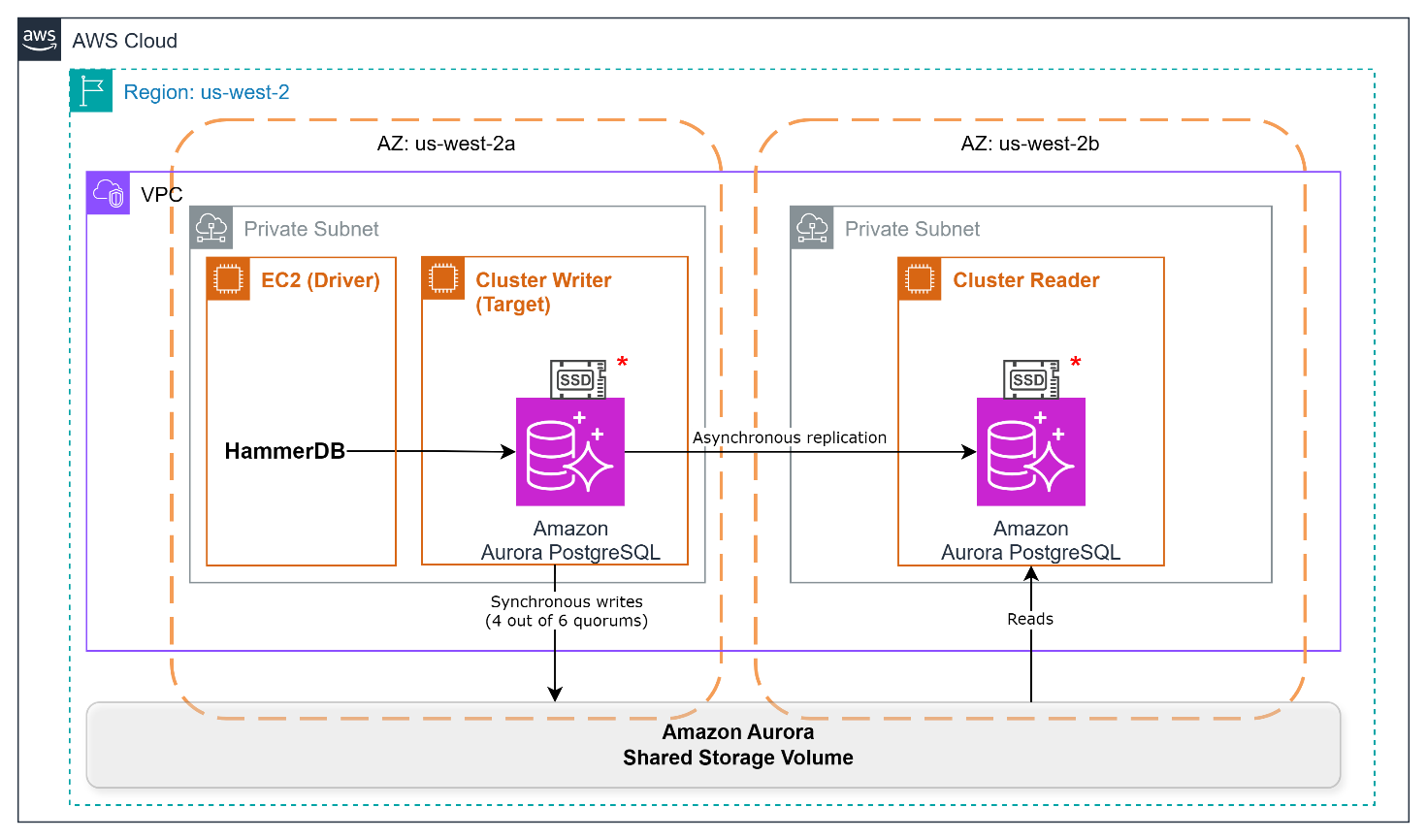 We used HammerDB to load the database and run workloads on an Amazon Aurora PostgreSQL 17.5 cluster. The warehouse configuration generated database sizes of approximately 128GB for small workloads (2xlarge) and 1,024GB for medium workloads (16xlarge) sizes, with both sizes exceeding the instance memory. We used concurrency as two times the vCPU with 10 minutes ramp-up and 20 minutes run in a 2xlarge (small workload) and 16xlarge (medium workload).
