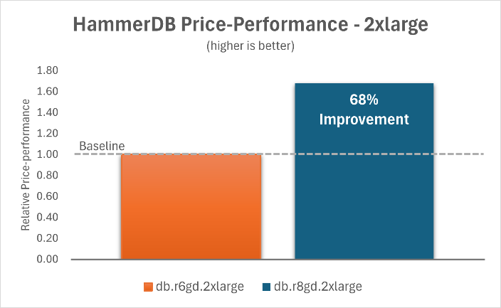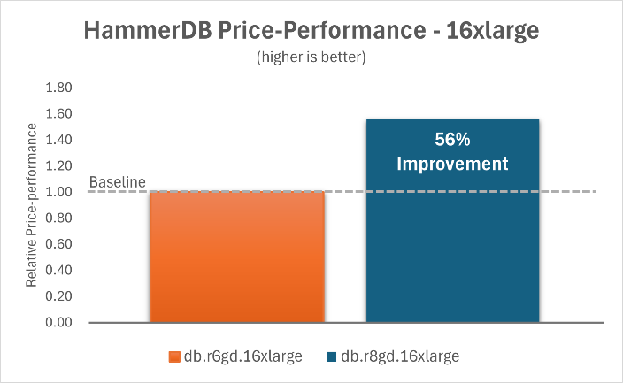 This metric combines an instance’s performance capabilities with its monthly cost to determine the value (performance) you receive for each dollar invested. We calculated this ratio using HammerDB NOPM divided by the instance’s on-demand monthly price on the US West (Oregon) AWS Region. A higher ratio indicates better value for your investment, because you’re achieving more database transactions per dollar.