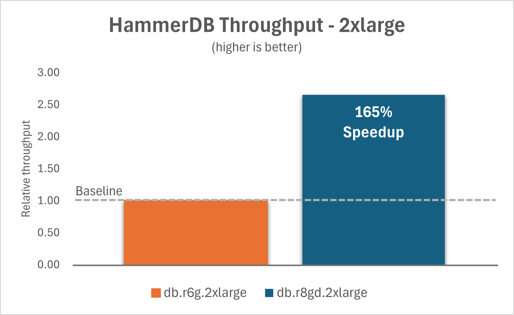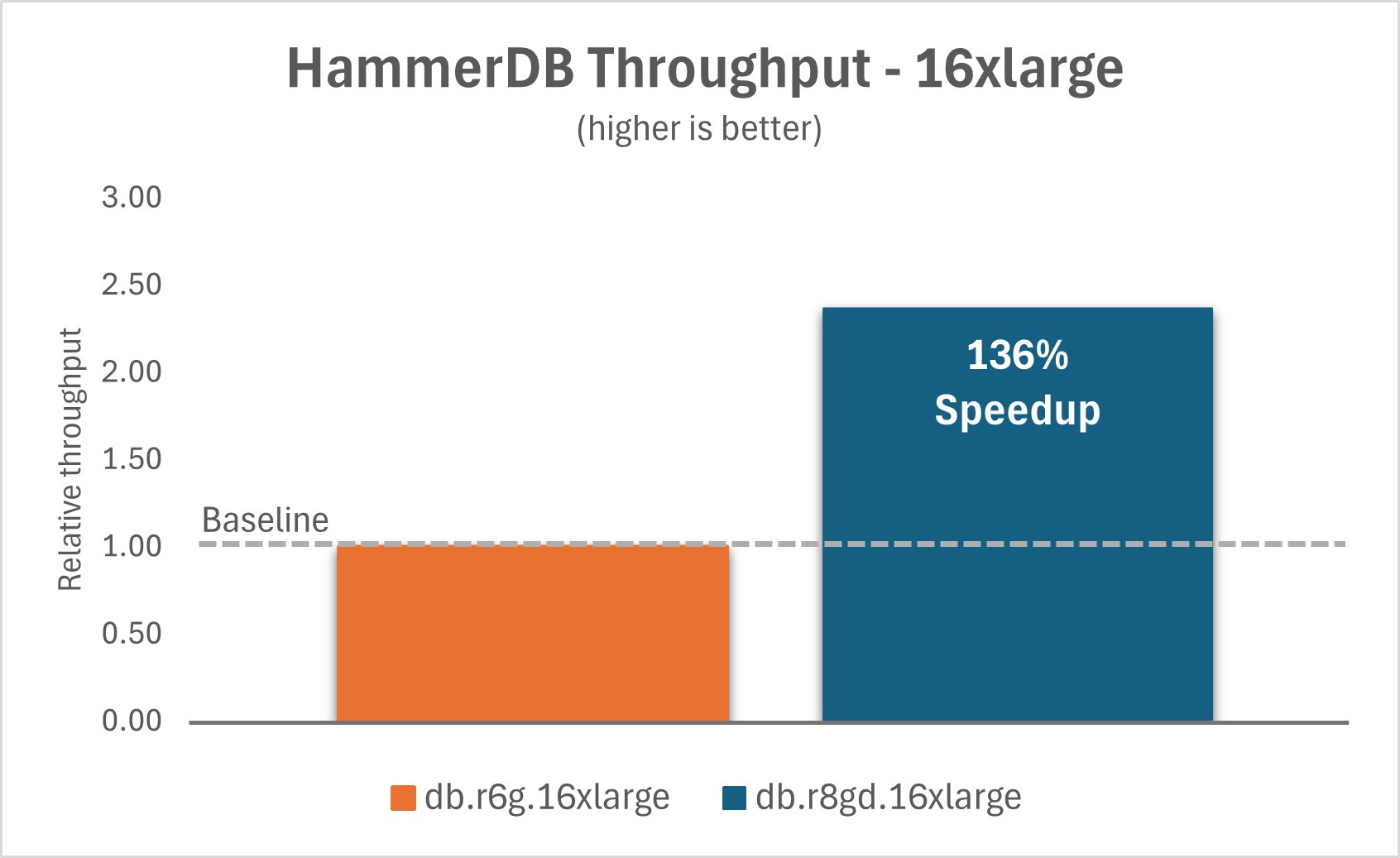 The results show that R8gd instances with Aurora PostgreSQL 17.5 can offer substantial improvements up to 165% higher throughput, up to 120% better price-performance ratio and up to 80% improvement in application response time, while also providing up to 256 TiB of storage space and flexibility of temporary objects storage size adjustments without cluster restart.