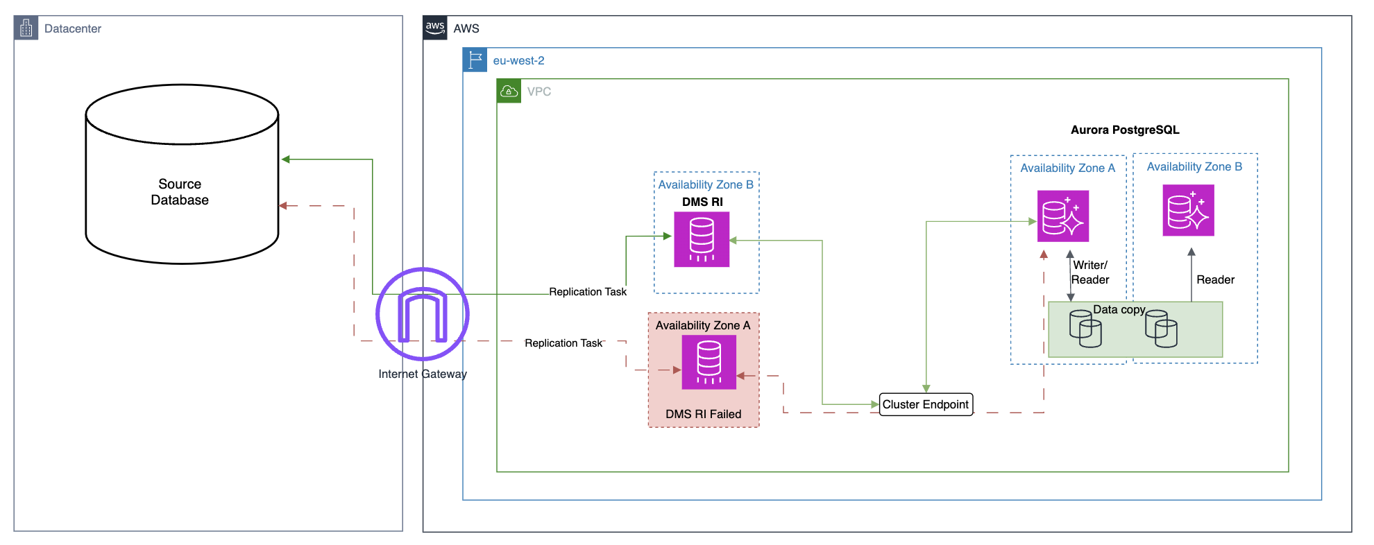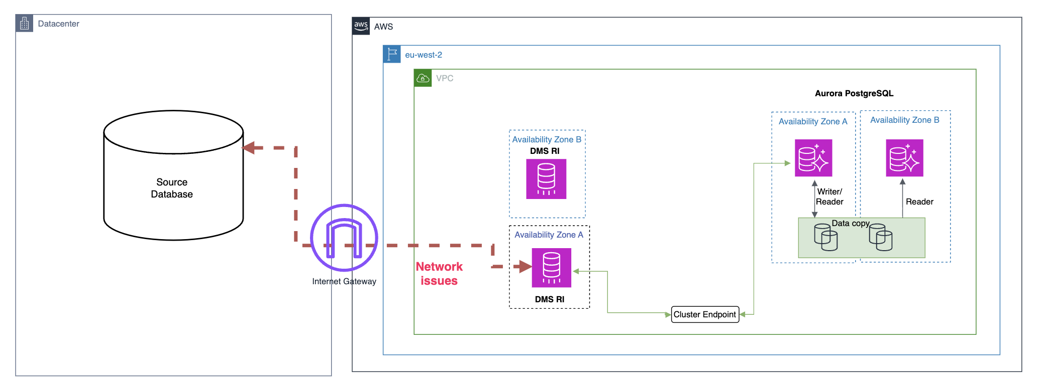 The connection can also be interrupted between the source and the AWS DMS replication instance by either a firewall or general network issues. For more details, refer to the previous section in this post regarding network failure.