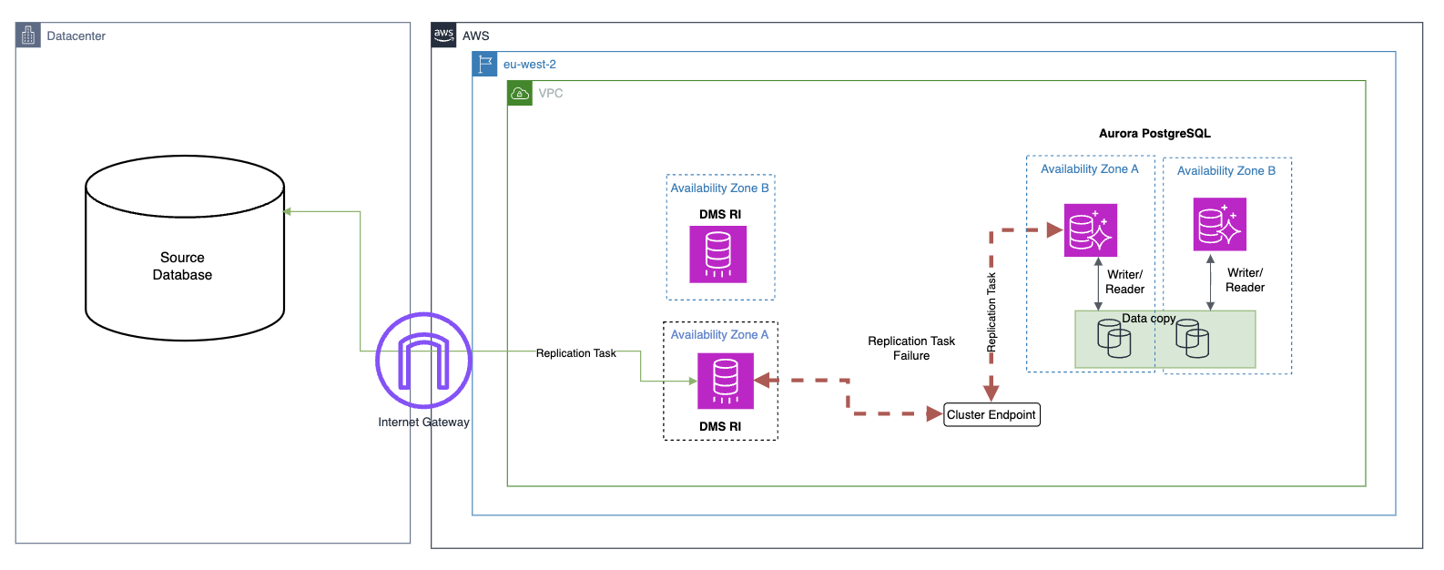 In this two-part series, we examine common failure causes for components like the source database, replication instance, migration task, and target database. We delve into investigative steps, provide error log samples, and offer mitigation guidance. Although this series primarily focuses on migrating from Oracle to Amazon RDS for PostgreSQL or Amazon Aurora PostgreSQL-Compatible Edition, the discussed scenarios can apply to other database combinations. In this post, we address failures related to the source, network, task, and replication instance. In Part 2, we cover validation-related issues, target database failures, and error handling strategies.