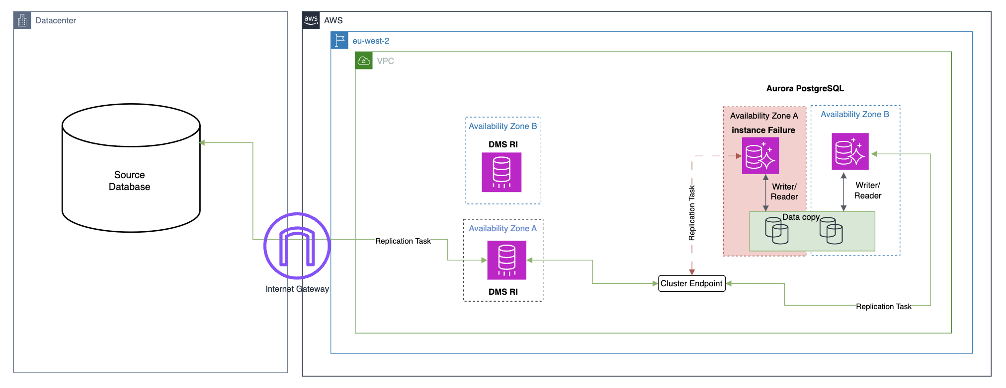 - For high availability, we recommend a Multi-AZ configuration by placing a read instance in a separate Availability Zone. An available reader instance will be promoted to the writer and inherit the cluster writer endpoint, which AWS DMS will attempt to reconnect.