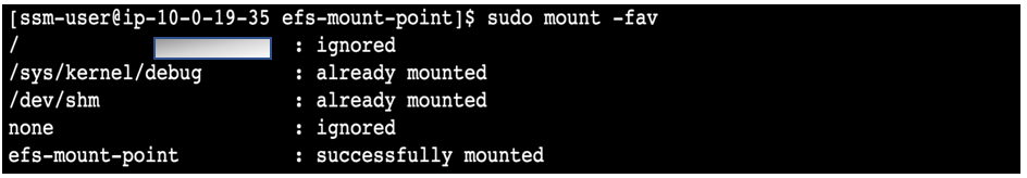 Make sure the /etc/fstab file reflects the exact path of your Amazon EFS directory . For this use case, the Amazon EFS directory is under /home/ss-user/efs-mount-point. Also, make sure you replace the file system identity with your specific file system.