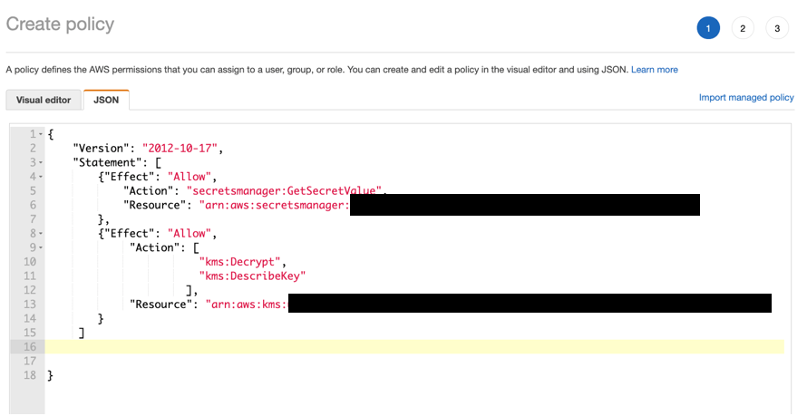 - On the JSON tab, enter the following policy to enable access to and decryption of your secret: