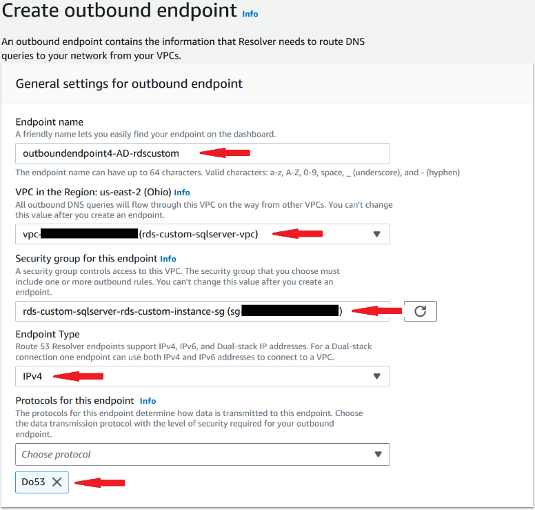 - Make sure your RDS Custom for SQL Server security group has the necessary rules to support Route 53 as well as any other services or applications. In our setup we added the following outbound rules to the VPC CIDR as destination: