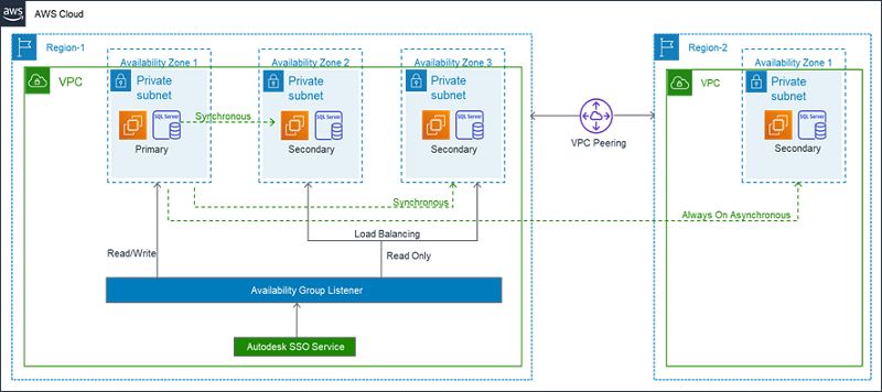 The following diagram shows Autodesk’s previous SQL Server architecture. The database ran on self-managed EC2 instances. The configuration included the Always On feature spread across multiple Availability Zones and one node in another Region for disaster recovery.