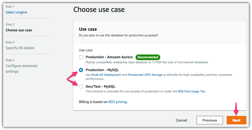 - Choose either Production – MySQL/MariaDB or Dev/Test – MySQL/ MariaDB at the use case prompt, as shown following, and then choose Next.
