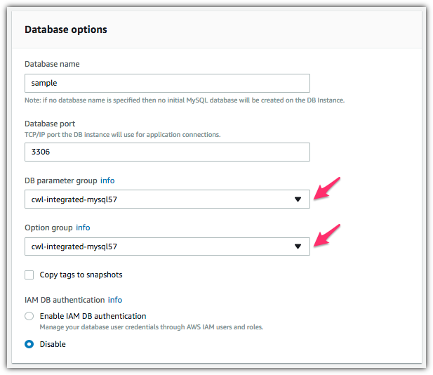 - In the Database options section, depending on the logs you plan to enable (see the prerequisites preceding), choose the relevant DB parameter group and Option group, as shown following. These might be the defaults provided, or custom ones.
