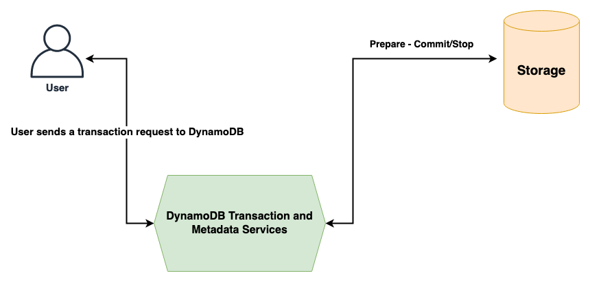 DynamoDB uses a two-phase commit protocol to process a transaction request. After a transaction request is received, DynamoDB’s internal transaction services co-ordinate the processing of the transaction with the underlying DynamoDB tables (see figure below). The transaction services identify the backend storage nodes that need to participate in the transaction, and execute the transaction over two phases: prepare and commit/stop.