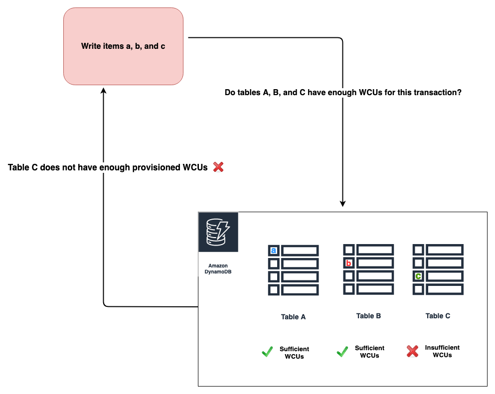 In the following example, a transaction is being requested for items a, b, and c across tables A, B, and C, which consume capacity in provisioned mode. As Table C doesn’t have sufficient capacity for the prepare phase, the transaction stops, without consuming any capacity units in any of the three tables.