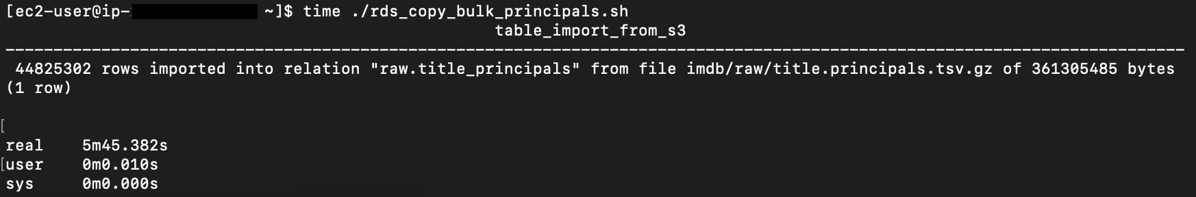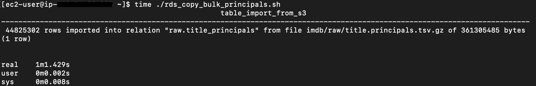 Before we start applying optimizations, let’s take a baseline measurement using the default database settings in a Multi-AZ configuration. From the IMDb dataset, we bulk load the largest file, titles.principals.tsv.gz, which is 361 MB.