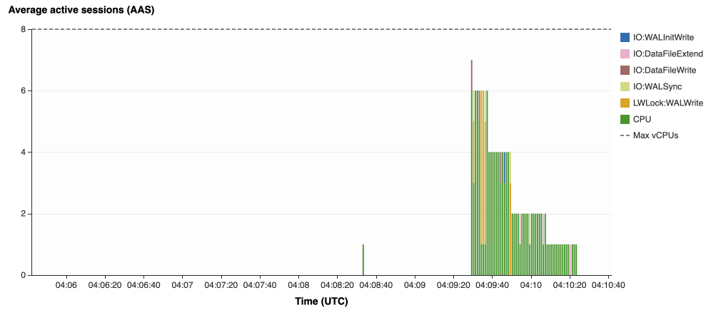 As expected, our db.r6g.2xlarge instance with 8 vCPU shows one active session.